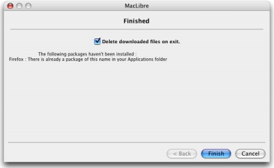 As you can see in this screenshot, if an application with the same name that the one MacLibre is trying to install is already in the Applications directory, MacLibre will ask you what to do with it : overwrite it or ignore this package and continue installation process.